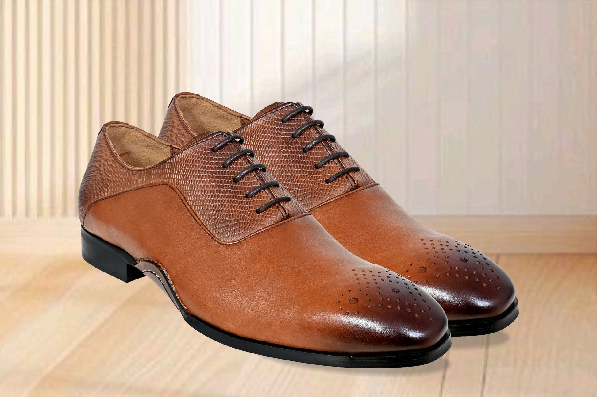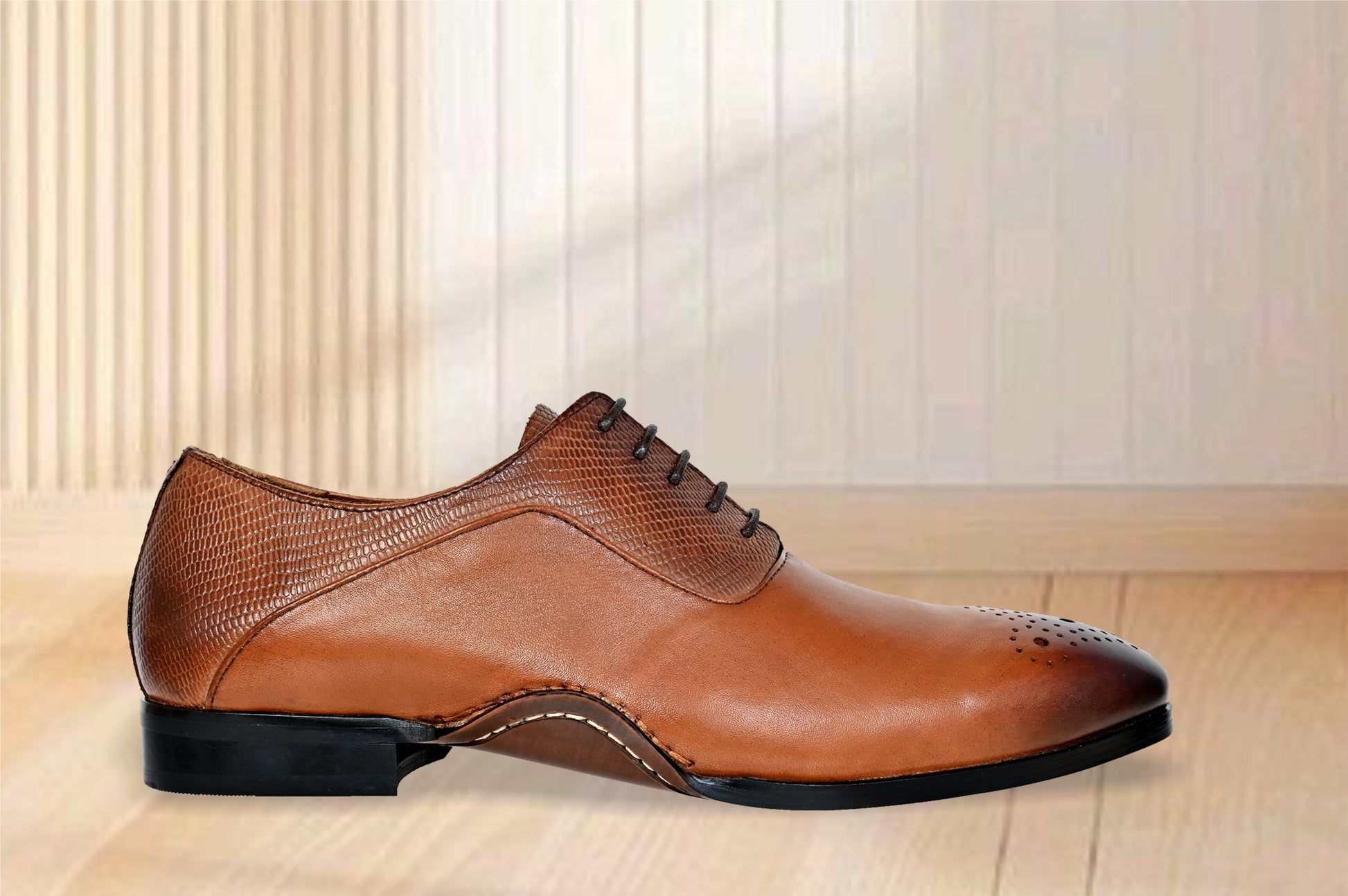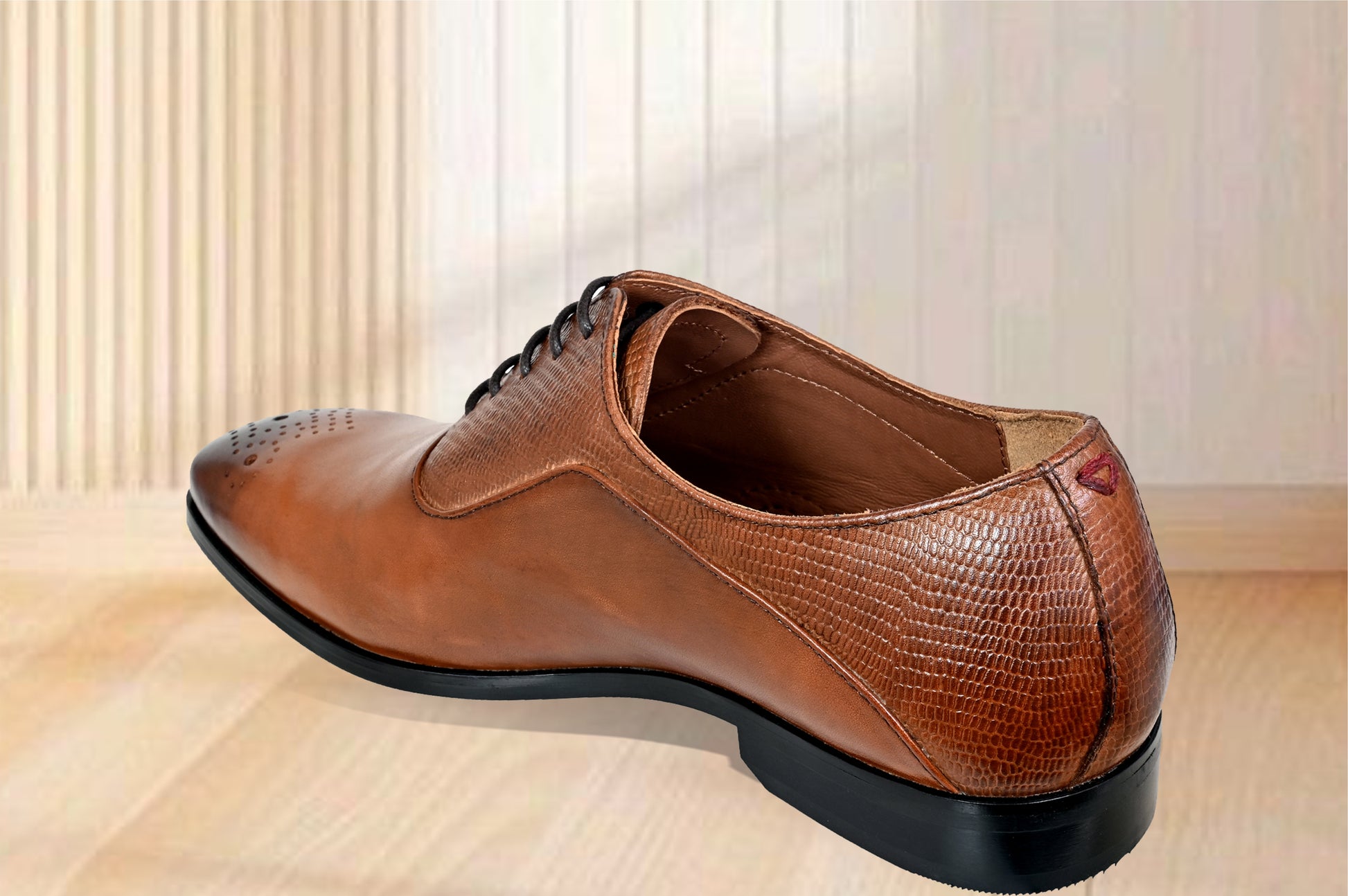 The shoe is made with premium quality genuine leather. The classic formal oxford shoe is styled with brogue toe and snake print quarter. The hand made resin sole comes with outer visible arch that is hand stiched to the upper, giving a unique style quotient. The shoe comes with leather inner lining & extra padded eva socks with memory foam providing long lasting comfort. IT IS BEST STYLED WITH TROUSERS, PANTS, SUITS, TUXEDOS & JEANS.