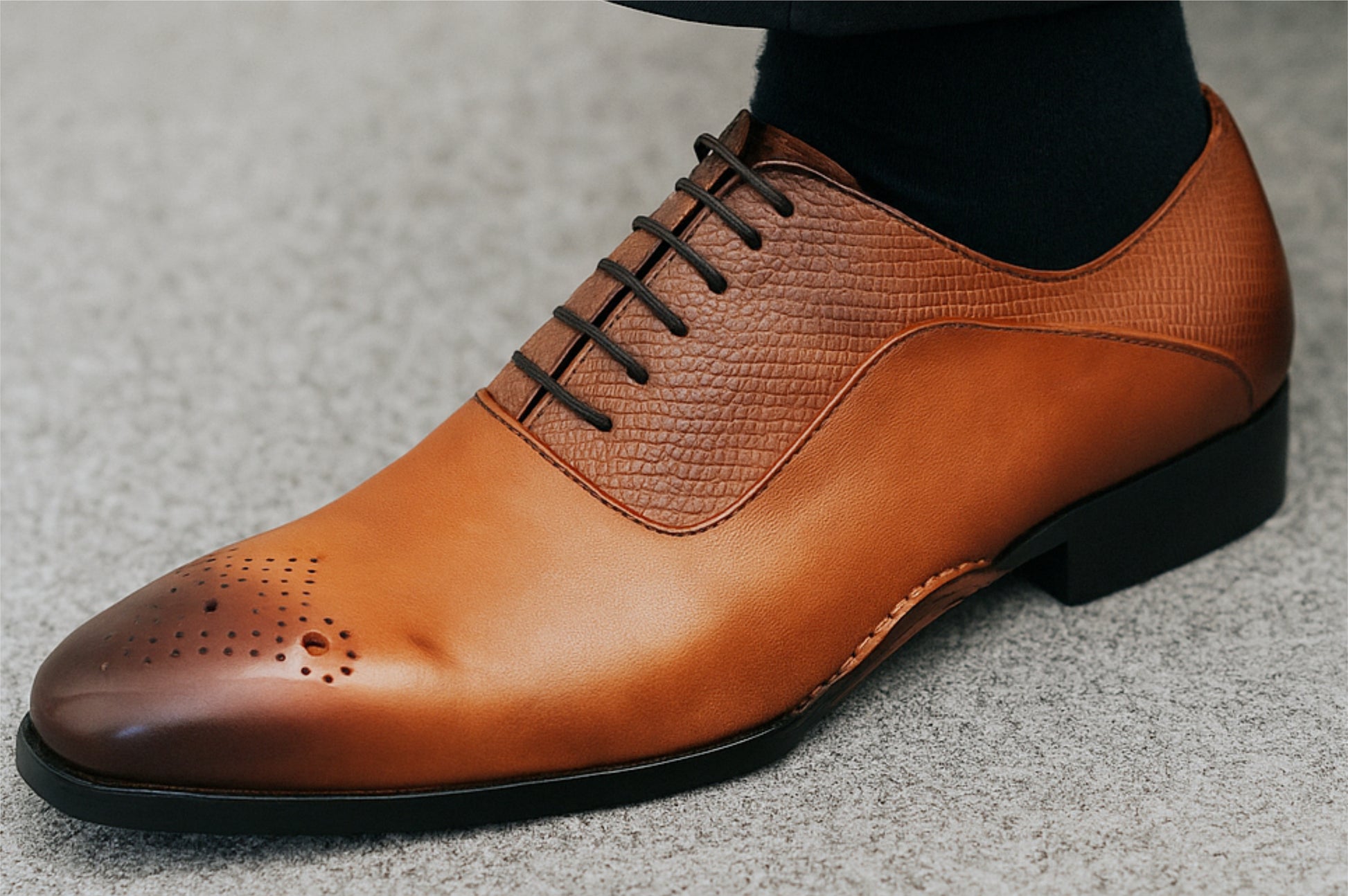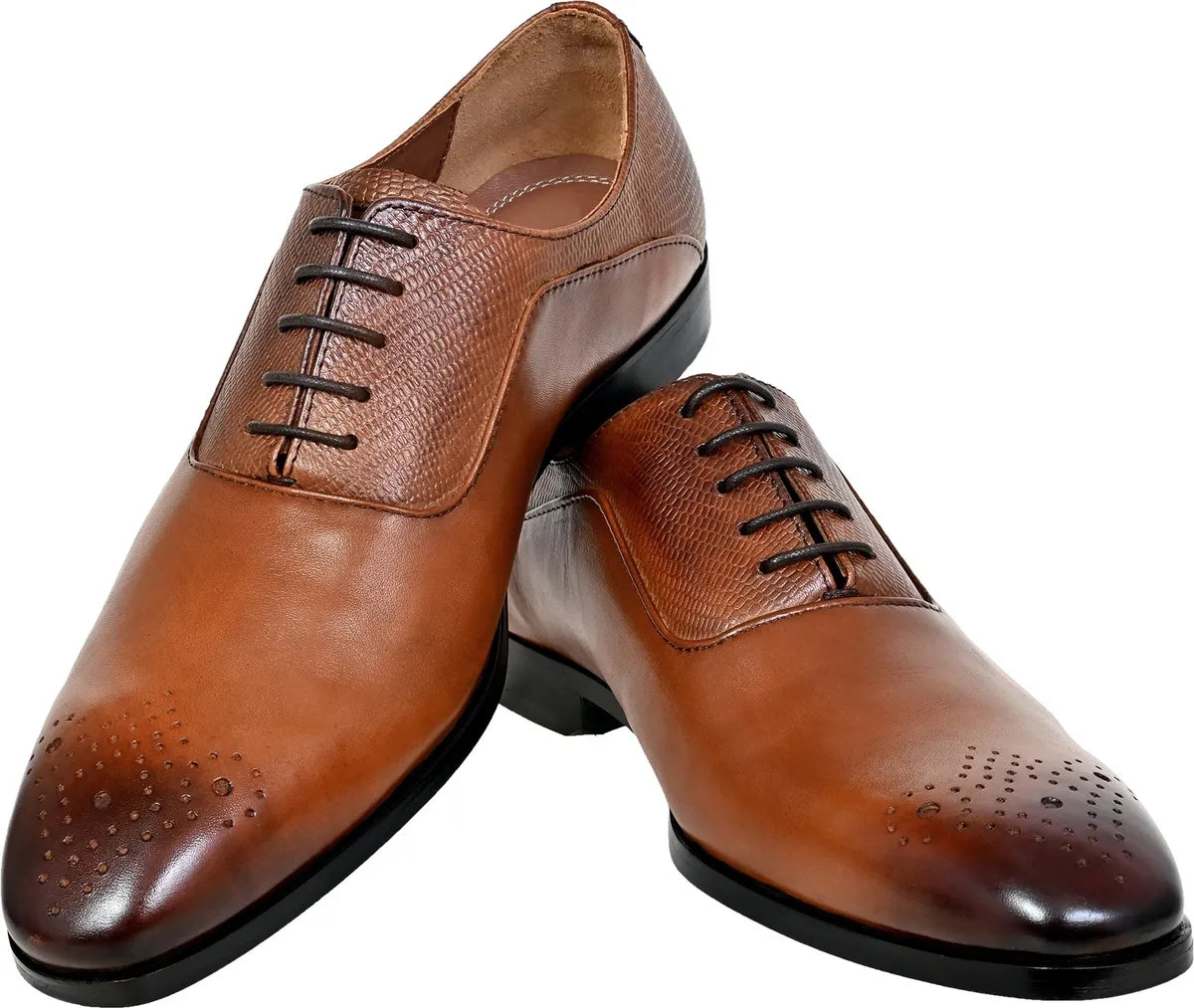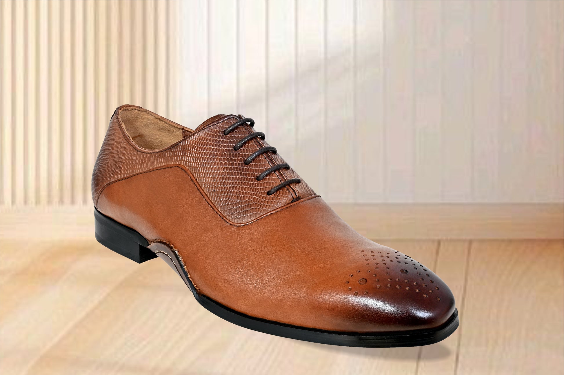 The shoe is made with premium quality genuine leather. The classic formal oxford shoe is styled with brogue toe and snake print quarter. The hand made resin sole comes with outer visible arch that is hand stiched to the upper, giving a unique style quotient. The shoe comes with leather inner lining & extra padded eva socks with memory foam providing long lasting comfort. IT IS BEST STYLED WITH TROUSERS, PANTS, SUITS, TUXEDOS & JEANS.
