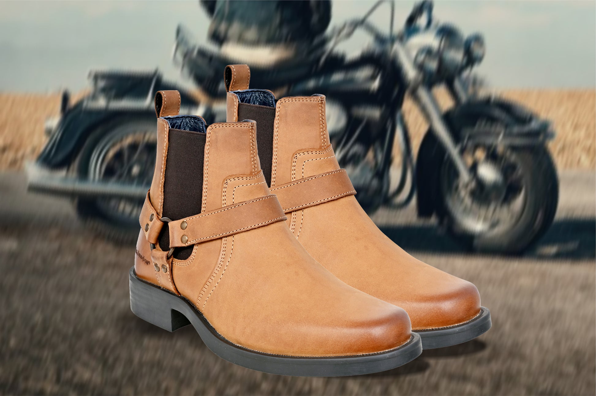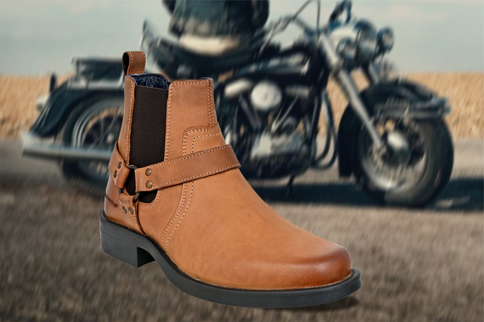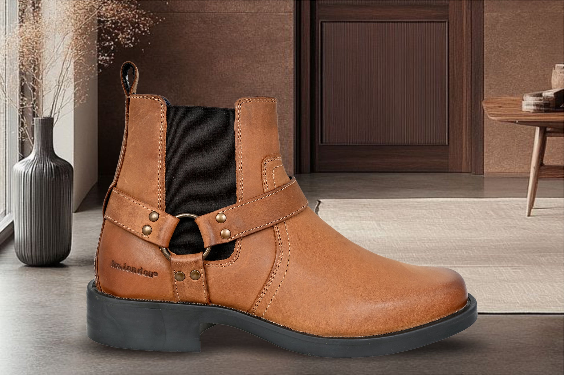 The shoe is made with premium quality waxy leather. The classic biker boot is styled with metal rings fastened with leather strap that provides firm grip and masculine look. It is best worn with jeans, cargos, chinos & bell bottoms. The thermoplastic rubber (TPR) sole gives excellent durability, strong grasp & high strength. The boot comes with synthetic breathable inner lining & extra padded pu moulded socks with memory foam providing long lasting comfort.