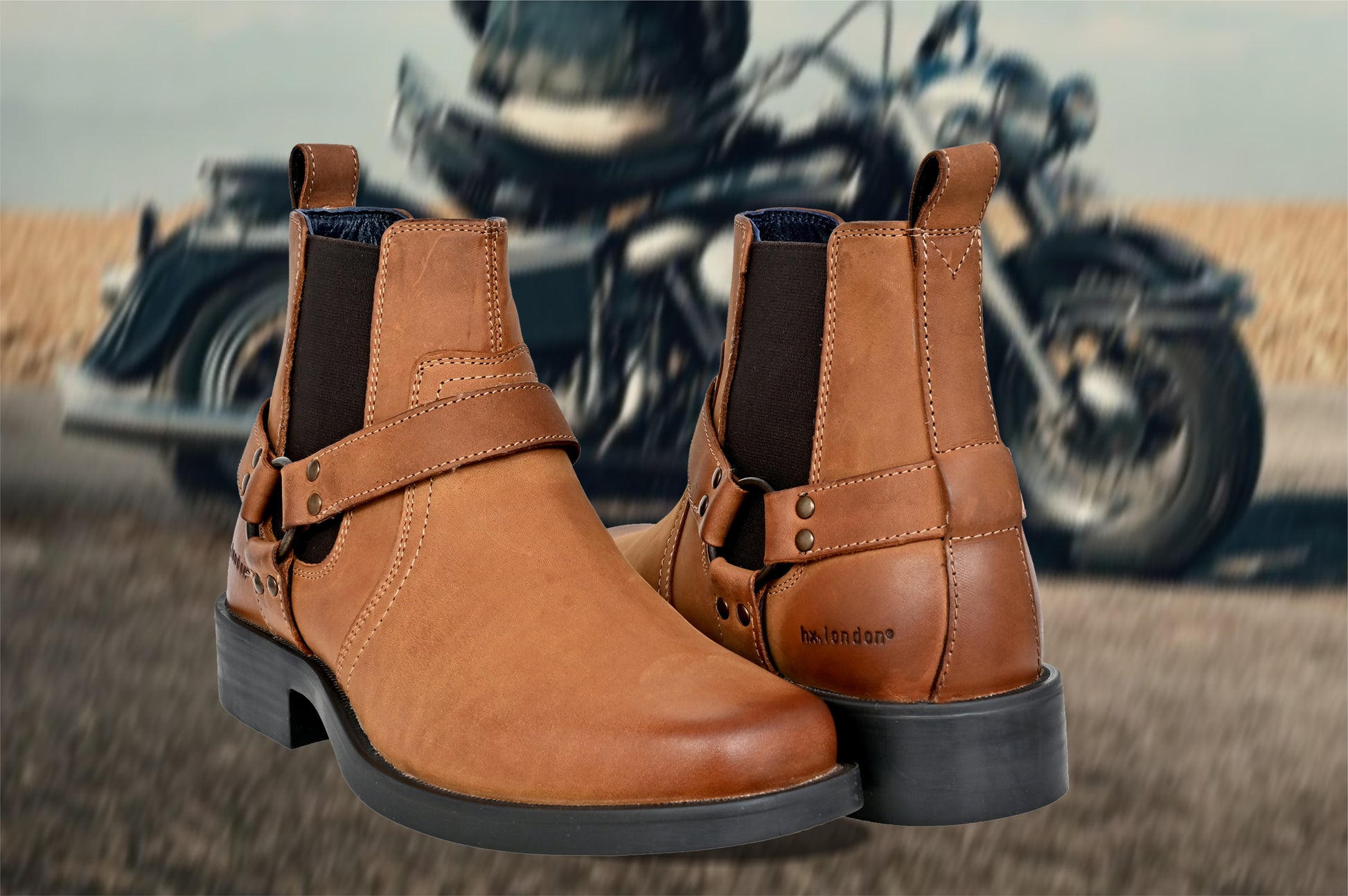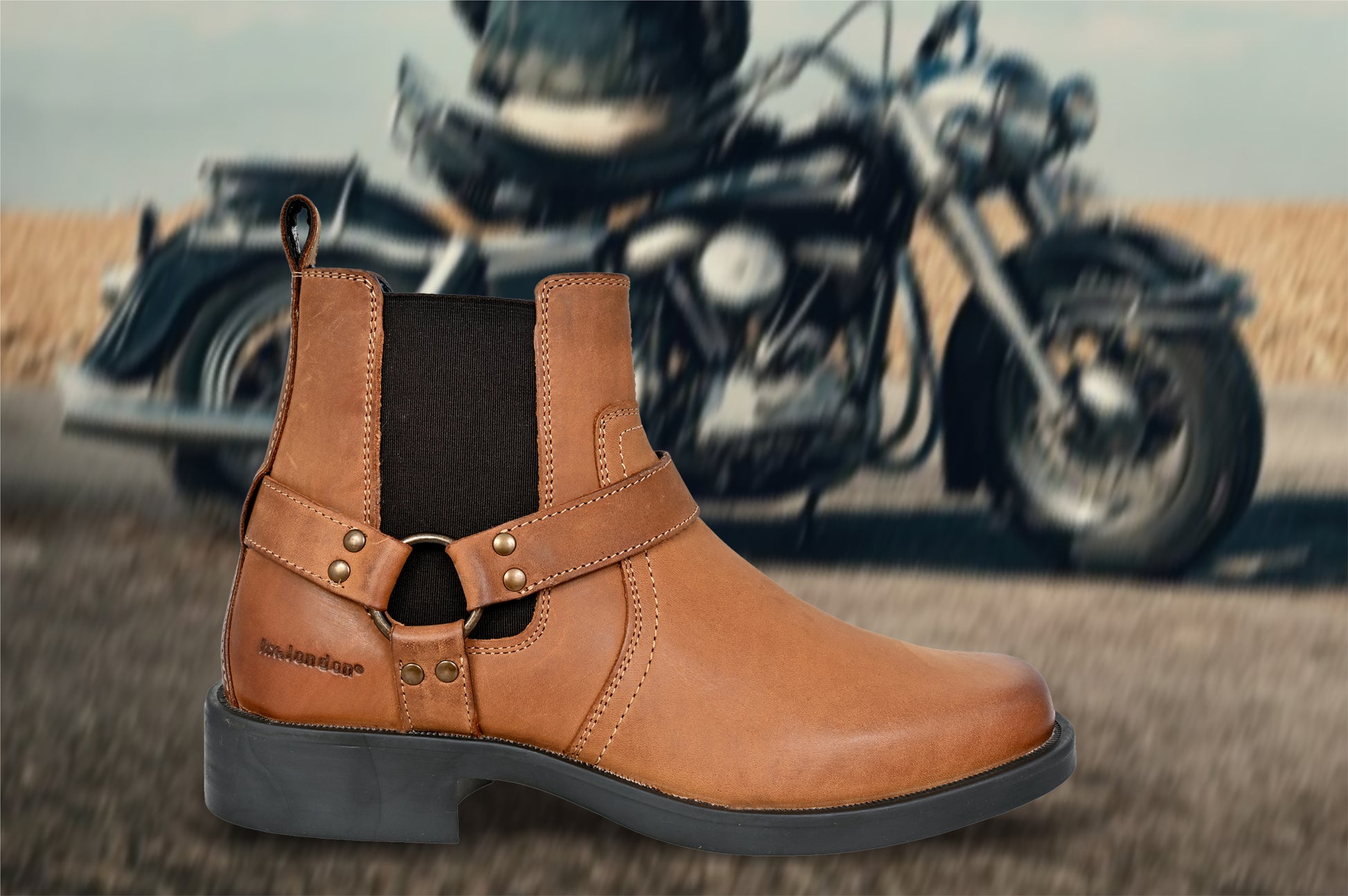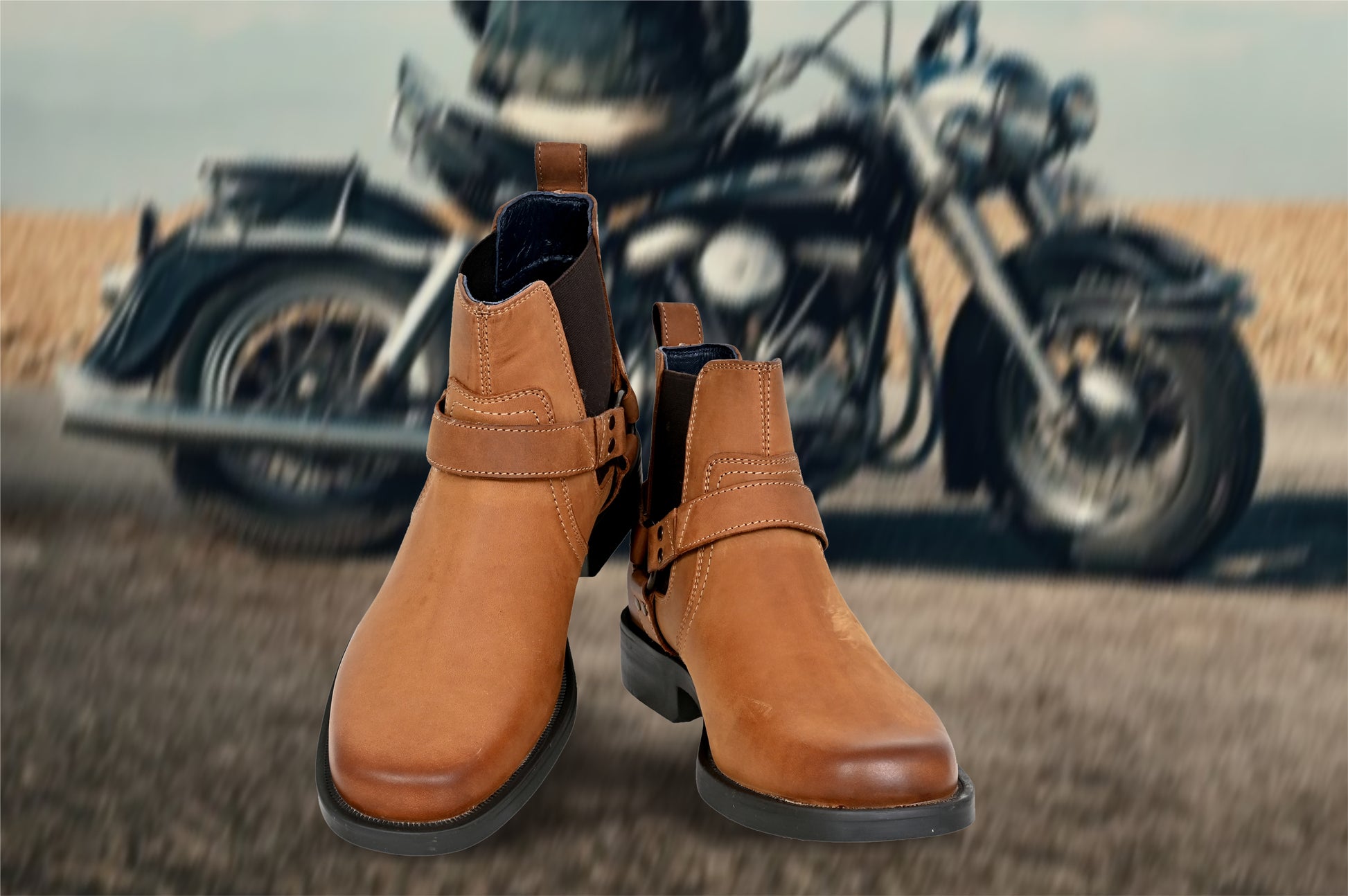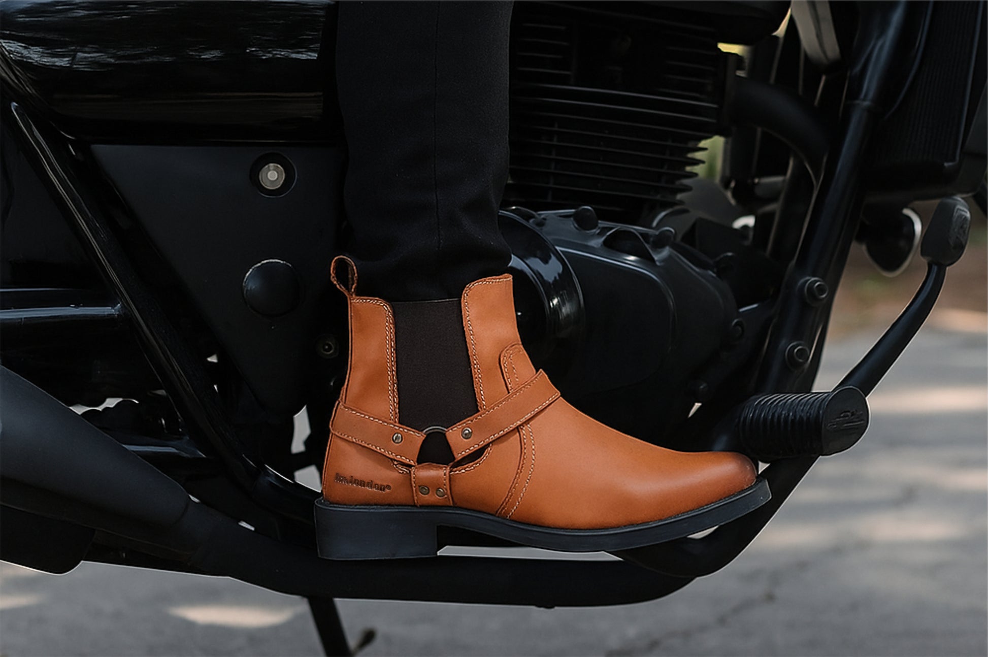 The shoe is made with premium quality waxy leather. The classic biker boot is styled with metal rings fastened with leather strap that provides firm grip and masculine look. It is best worn with jeans, cargos, chinos & bell bottoms. The thermoplastic rubber (TPR) sole gives excellent durability, strong grasp & high strength. The boot comes with synthetic breathable inner lining & extra padded pu moulded socks with memory foam providing long lasting comfort.