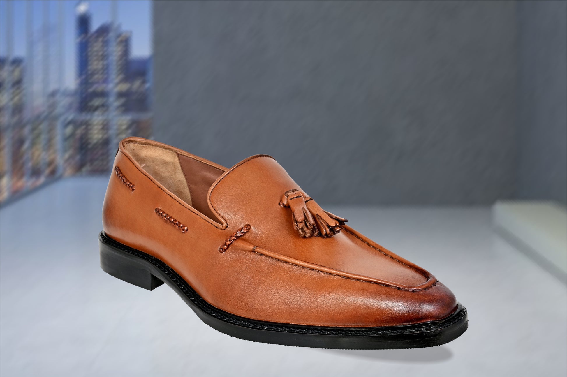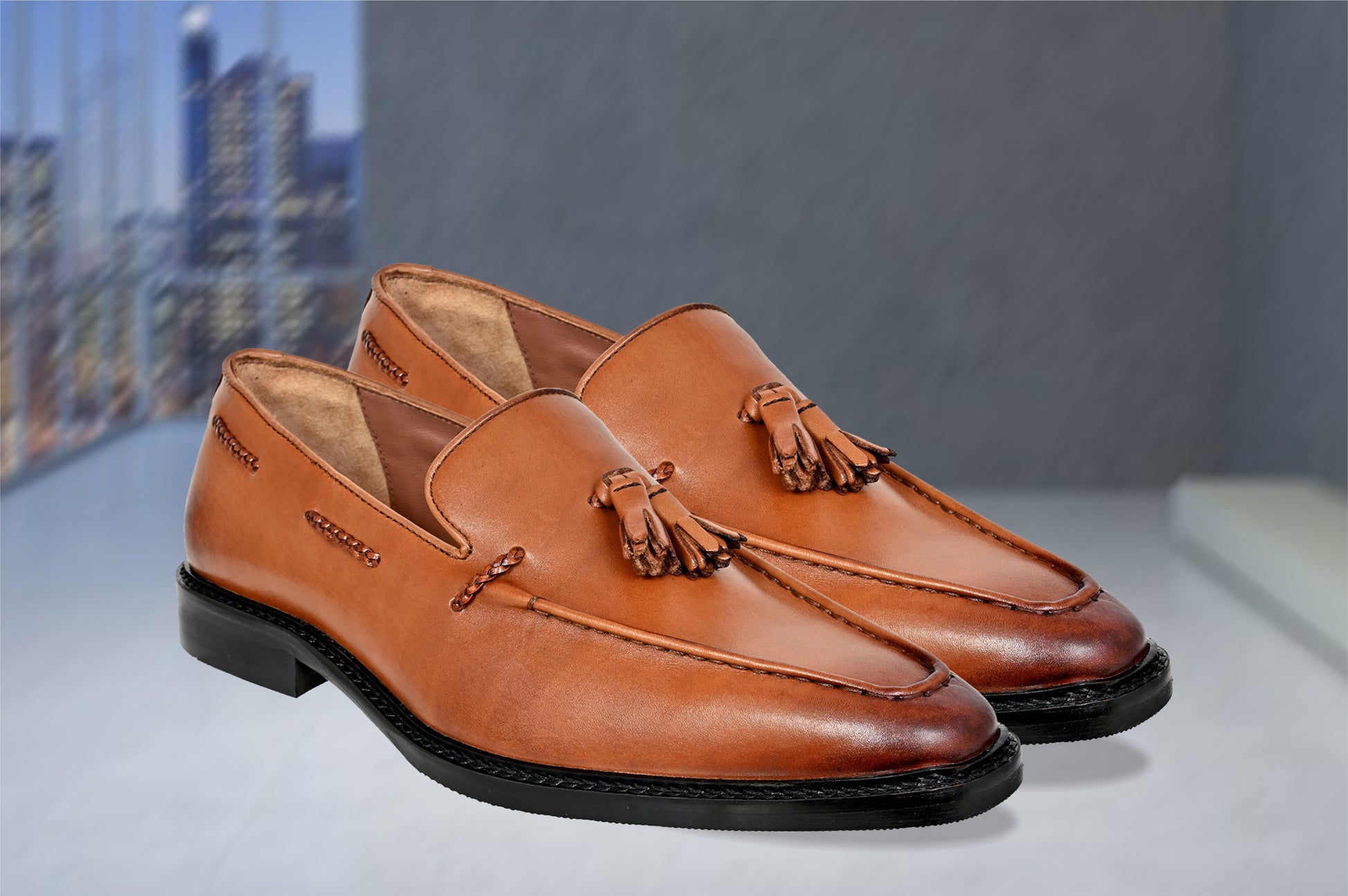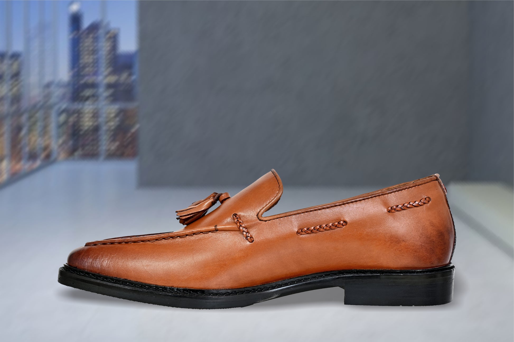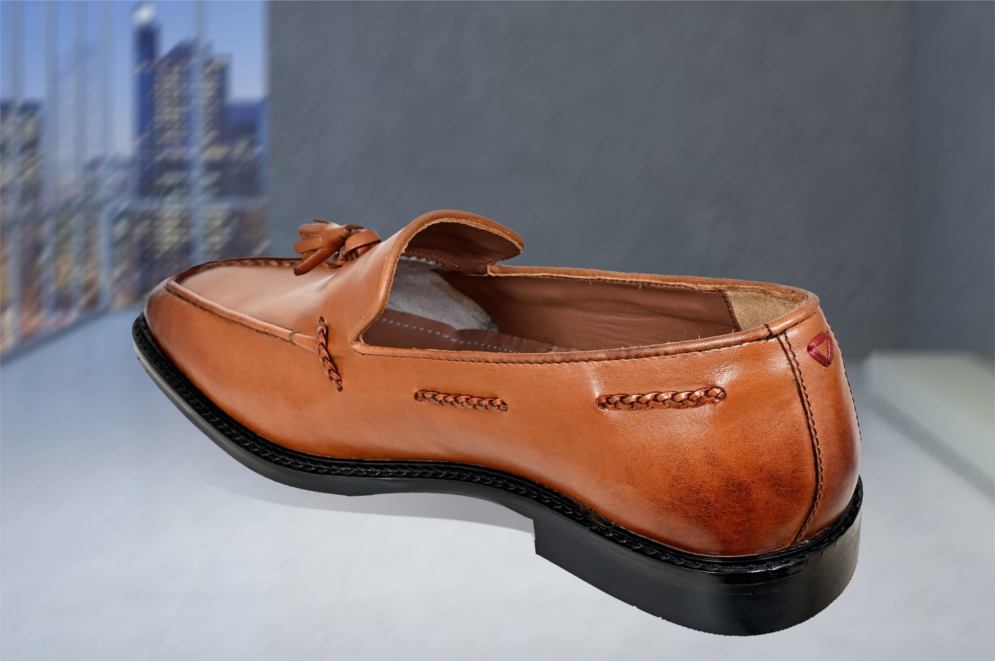 The shoe is made with premium quality crust leather. The classic formal wear shoe is styled with tassel. The hand made resin sole gives a unique style quotient. The shoe comes with leather inner lining & extra padded eva socks with memory foam providing long lasting comfort. It is best worn with tuxedos, suits, trousers and jeans.