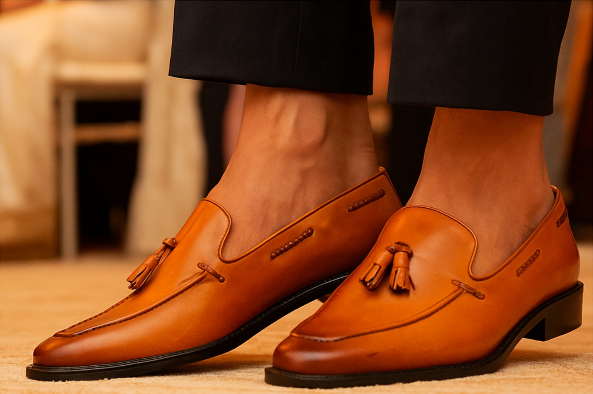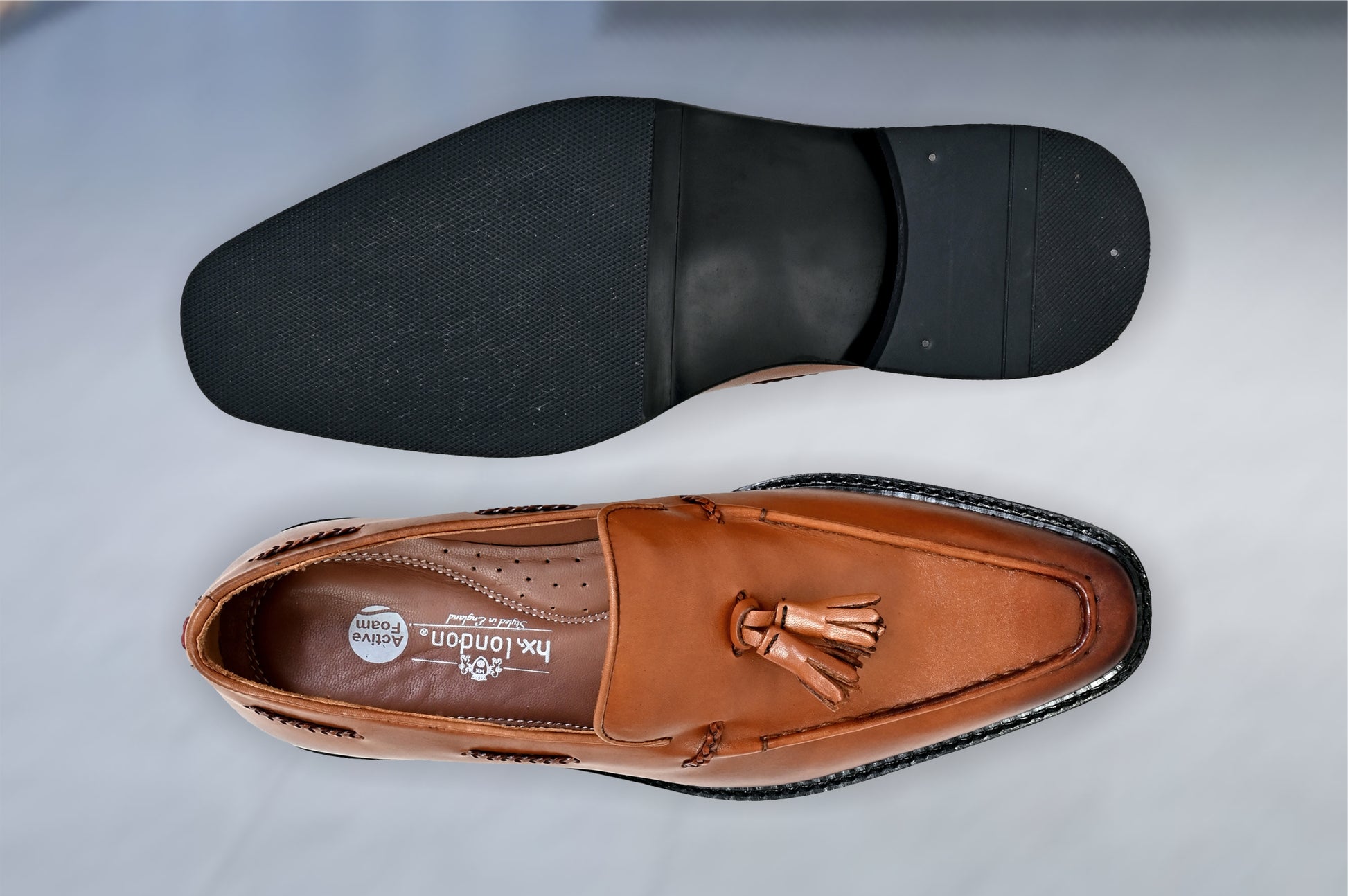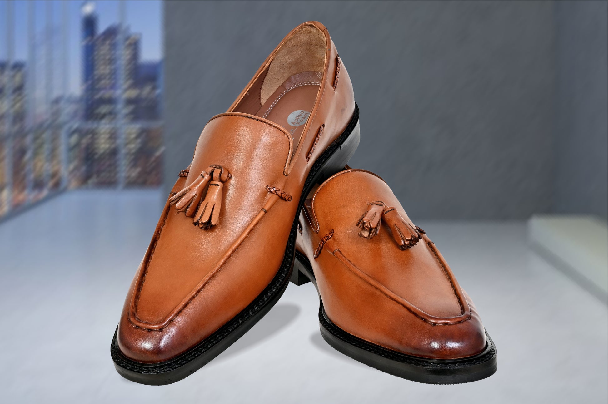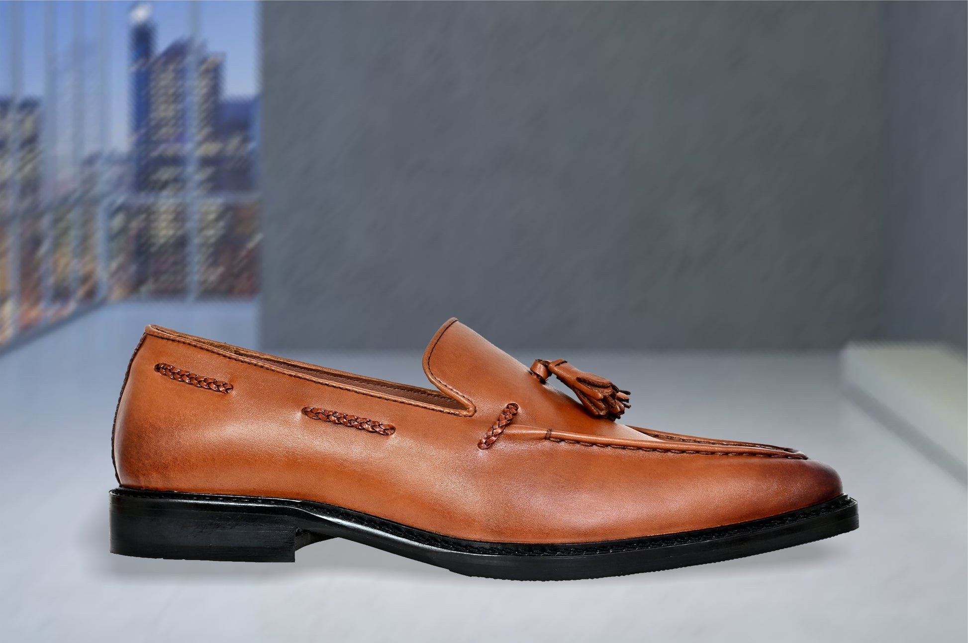 The shoe is made with premium quality crust leather. The classic formal wear shoe is styled with tassel. The hand made resin sole gives a unique style quotient. The shoe comes with leather inner lining & extra padded eva socks with memory foam providing long lasting comfort. It is best worn with tuxedos, suits, trousers and jeans.